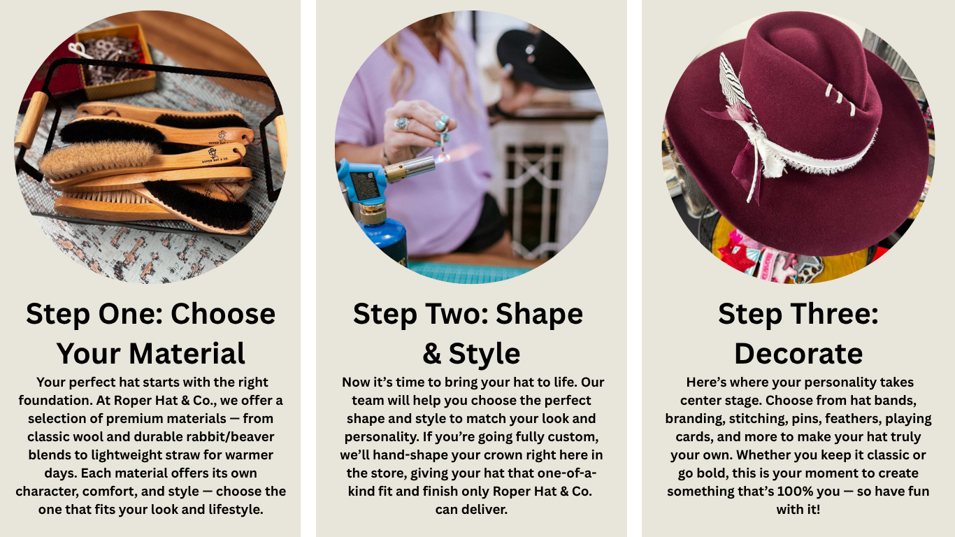 Book NowCustom hats by Roper Hat & Co start at $175 and range up to $450, depending on style and customization. Each appointment is 45 minutes or longer.