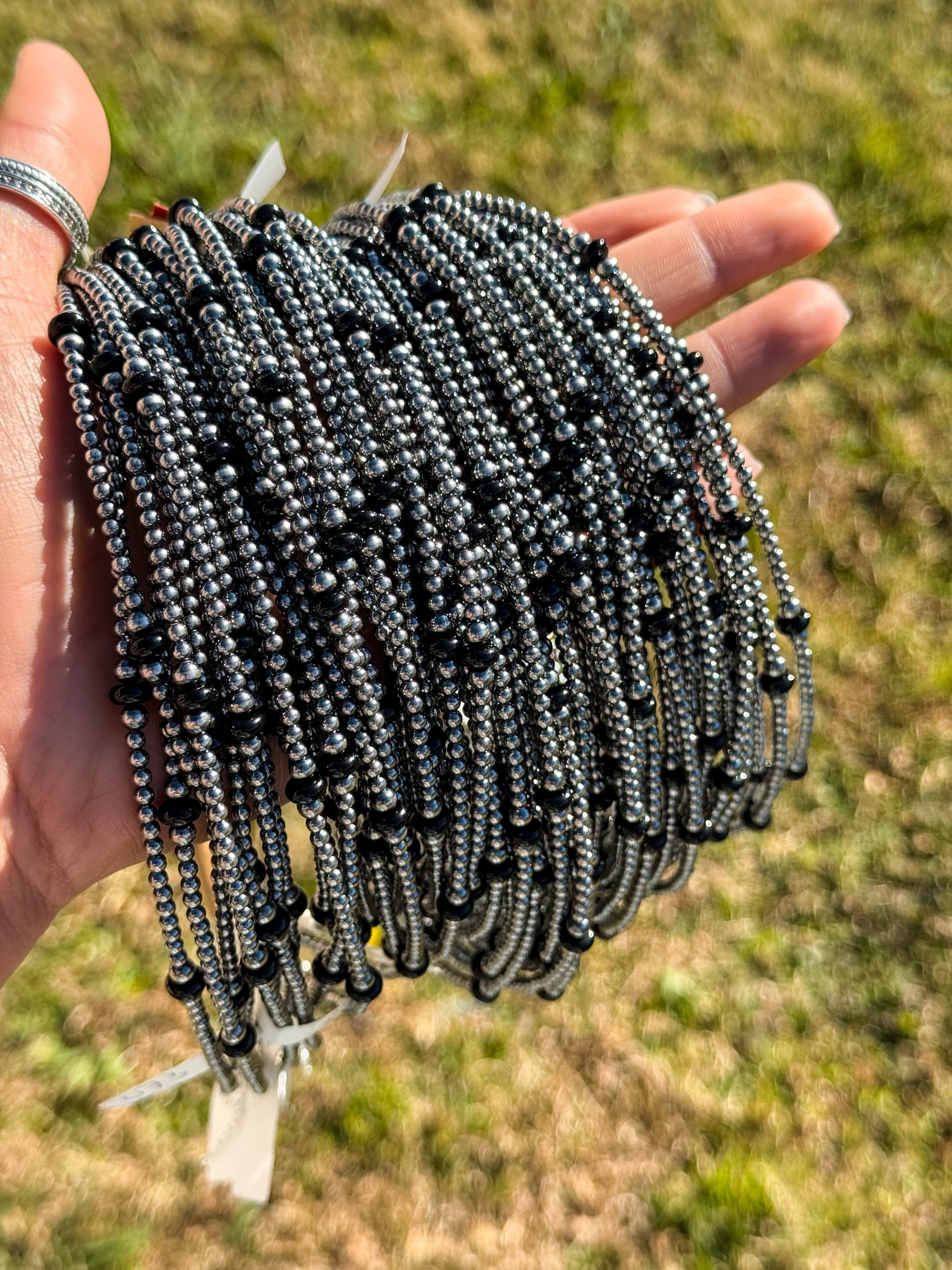 Made in the USA, it features alternating 3mm and 4mm sterling silver pearls paired with striking 6mm faceted Black Onyx rondelles, creating a modern yet classic contrast of shine and depth.