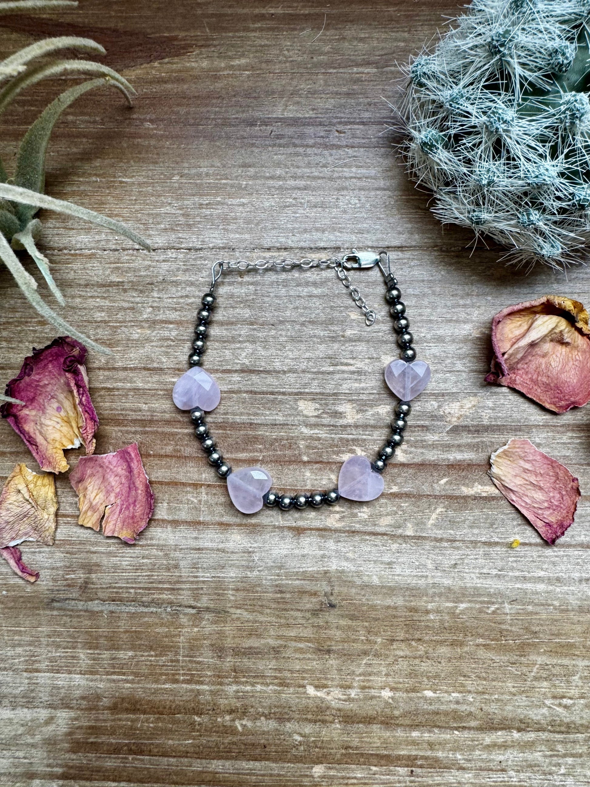 Valentine Bracelet - 4 mm sterling silver pearls and Rose Quartz heart
